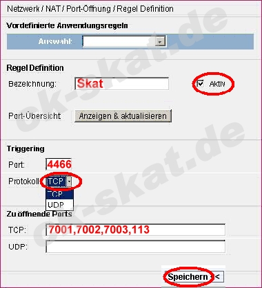 Das Web-Interface des Routers erreichen Sie über http://192.168.2.1 Loggen Sie sich ein: Password: 0000 (bzw. Ihr angelegtes Passwort) Die Einstellungen finden Sie unter Netzwerk -> NAT -> Port-Öffnung -> Regel definieren Die Eintragungen nehmen Sie bitte gemäß der Abbildung vor: Liebe Grüße und allzeit beste Karten Chris www.ck-spiele.de mail@ck-spiele.de Tel. (030) 451 25 54 Logged |