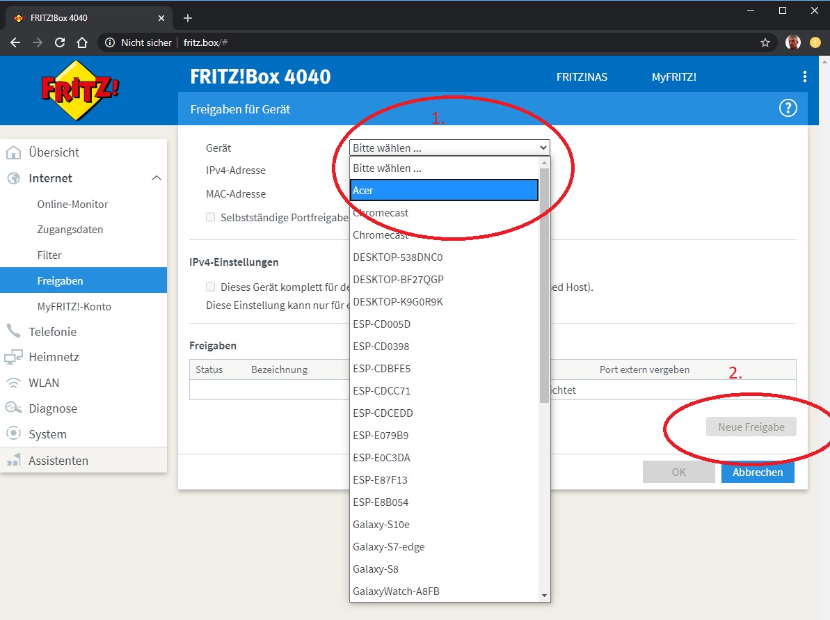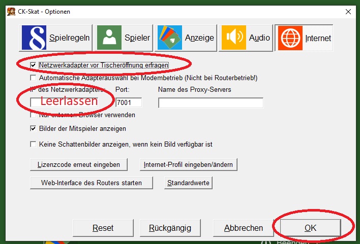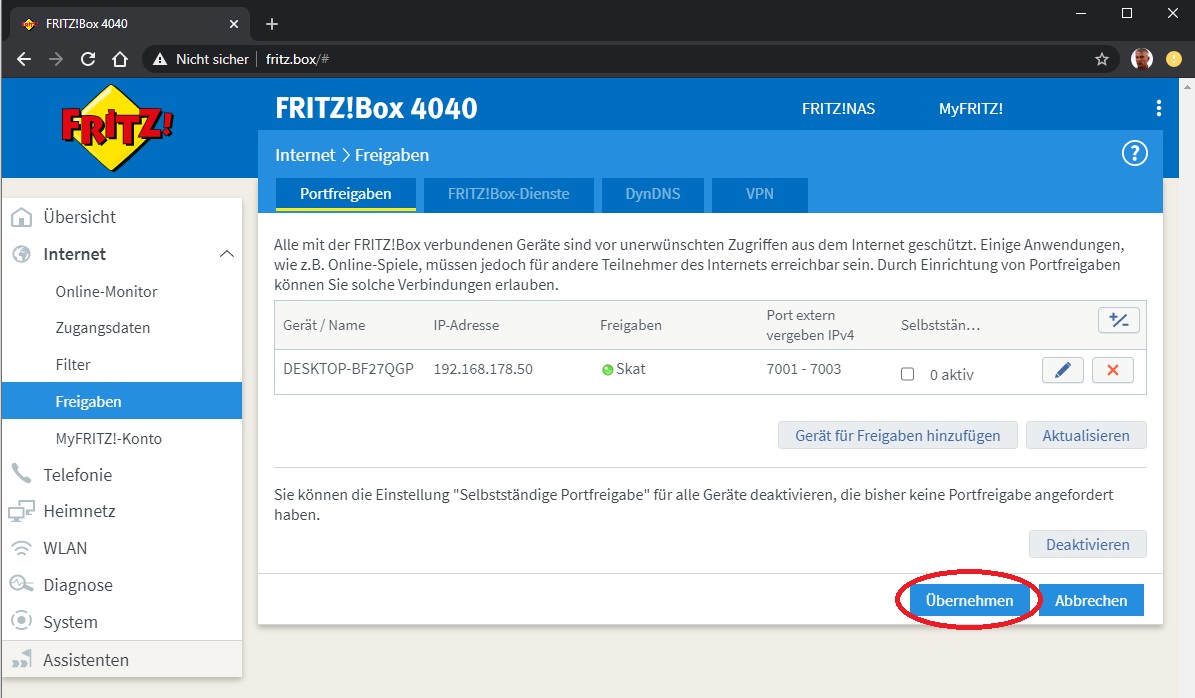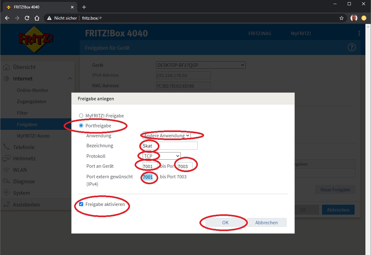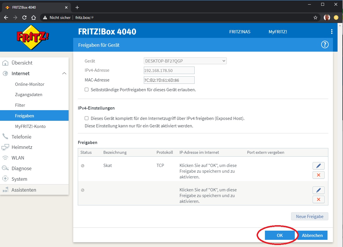 Die Konfigurationbeschreibung gilt sowohl für CK-Skat als auch für CK-Doppelkopf Pro: 1. Öfnnen Sie mit Ihrem Webbrowser (z. B. Internetexplorer, Firefox etc.) die Web-Interface Ihrer Fritzbox über http://fritz.box. Sofern Sie ein Kennwort hinterlegt haben wird dies nun abgefragt. 2. Klicken Sie in der linken Navigationsleiste auf die Schaltfläche "Internet -> Freigaben -> Neues Gerät für Freigaben hinzufügen". ![]() 3. Wählen Sie Ihr Gerät (Computer) aus und wählen Sie "Neue Freigabe" ![]() 4. Wählen Sie jetzt "Portfreigabe", "Andere Anwendung", füllen Sie die Felder wie abgebildet aus und klicken Sie auf "OK": ![]() 5. Klicken Sie auf OK um die Freigabe zu aktivieren ![]() 6. Klicken Sie auf "Übernehmen" ![]() Damit ist die Einrichtung der Portfreigabe abgeschlossen. ACHTUNG! Bei CK-Skat muss unter "Optionen"->"Internet" die Option "IP-Adresse erfragen" aktiviert sein und das Feld für die IP-Adresse leer bleiben: ![]() Modified by webmaster on 09.07.2020 , 17:38 Modified by webmaster on 09.07.2020 , 17:39 Modified by webmaster on 09.07.2020 , 17:40 Modified by webmaster on 09.07.2020 , 17:46 Liebe Grüße und allzeit beste Karten Chris www.ck-spiele.de mail@ck-spiele.de Tel. (030) 451 25 54 Logged |
